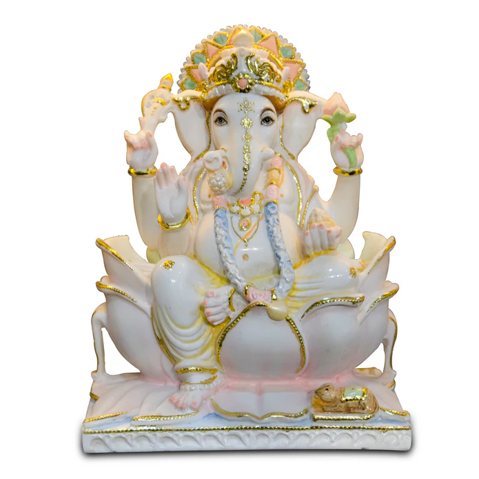 Introducing the Lord Ganesh 12-inch white marble statue from Handicraft Bazaar. This premium quality murti features Ganesh ji in a sitting position, with a curved trunk and a mouse by his side. This eye-catching piece of art is sure to be a focal point in your home or office.