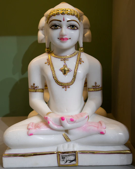 This stunning premium white marble Mahavir Swami statue celebrates the beauty of traditional Indian craftsmanship. The intricately detailed figure is adorned with a golden touch for a graceful finish. An exquisite addition to any space.