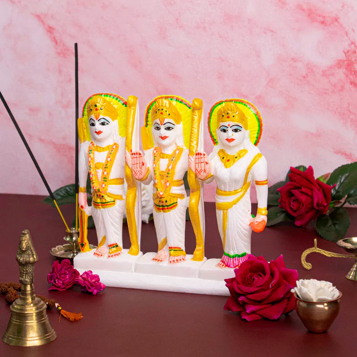 Display the spiritual in your home with this beautiful White Ram Darbar Marble Statue. Handcrafted with skillful attention to detail, this statue faithfully depicts Ram Darbar in standing position. It's a stunning piece for any home or collection.